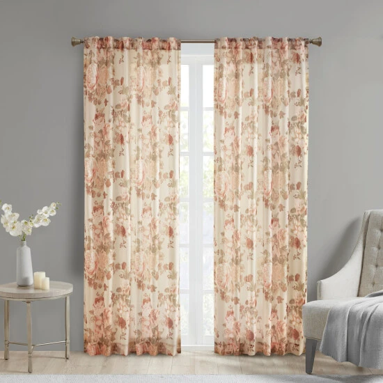 The Madison Park Abelia Printed Floral Rod Pocket and Back Tab Top Voile Sheer brings a soft and romantic touch to your home decor. This voile sheer curtain panel features a beautiful soft tone printed floral on a neutral ground ground for a rich and stylish contrast, while the lightweight fabric adds a delicate and airy touch while it’s also OEKO-TEX certified. Simply hang on rod pocket top or back tabs for a more tailored look; Fits up to a 1.25″ diameter standard size rod.