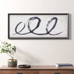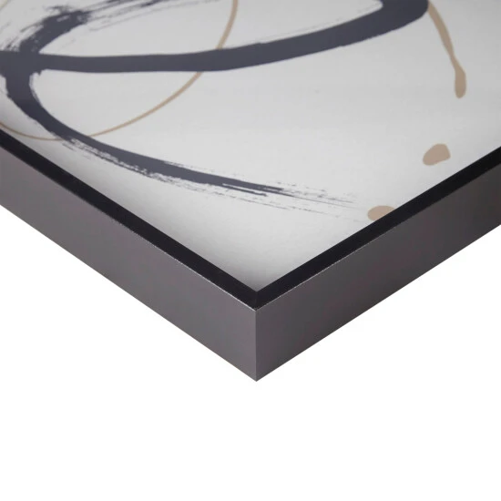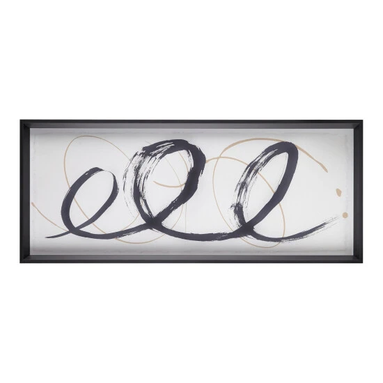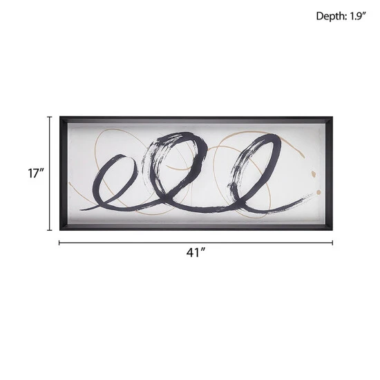 The Madison Park Abstract Ambit Contrast Black Frame Graphic Wall Art offers a modern elegance to your home and decor. Bold black and matte gold tone brushstrokes are printed on a light neutral ground and feature deckled edges, for rich texture and an elevated look. The contrasting black frame flaunts a sloped moulding that adds beautiful depth and dimension to this abstract modern wall art. Placed behind glass for an elevated gallery look, this brush stroke wall art uses 4 D-rings on the reverse for easy hanging to bring a refined touch to any space. Comes as a large single piece measuring 41 x 17 inches. Spot clean only.