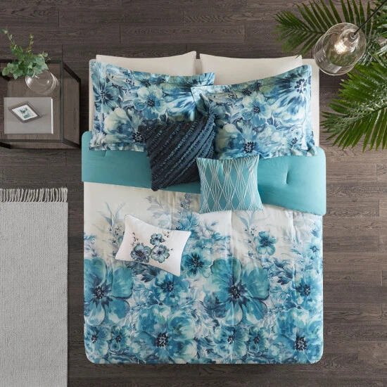 Madison Parkβs Adella 7 Piece Cotton Printed Comforter Set introduces a beautiful splash of color to your bedroom. A floral watercolor print is gorgeously displayed on the 100-percent cotton percale comforter and shams, for a stunning casual allure. The solid reverse and bed skirt complement the top of the bed to create a chic coordinated look. Three decorative pillows with embroidered details and fabric manipulation add a charming accent to complete the bedding set. Sure to brighten up your bedroom, this bedding set is also OEKO-TEX certified, meaning it does not contain any harmful substances or chemicals to ensure quality comfort and wellness.