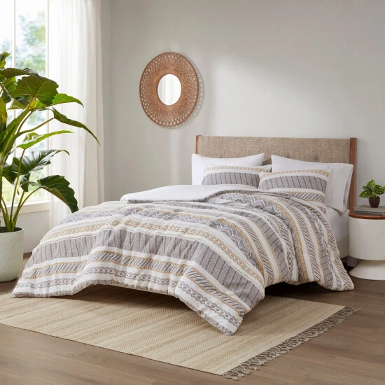 Give your bedroom a cozy farmhouse charm with the Madison Park Aella 3 Piece Cotton Printed Duvet Cover Set. This cotton duvet cover features a printed waffle design and various geometric patterns with chenille trim details, for a farmhouse look. The 2 matching shams pair perfectly with similar yellow and charcoal prints add the finishing touches to this casual duevt cover set. Machine washable for easy care, this cotton printed duvet cover set offers a modern take on a charming farmhouse style to update your bedroom. A button closure secures a padded insert within the duvet cover and inside corner ties prevent it from shifting (insert is NOT included).