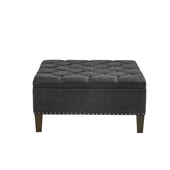 This elegant, robustly constructed square ottoman is upholstered fabric and features a button tufted top with piping details to create a chic traditional look. A nailhead trim on bottom adds an elegant touch, as solid wood legs complement the upholstery.