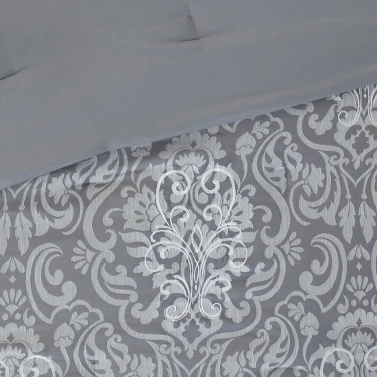 Give your bedroom a touch of elegance with the Madison Park Audrey 8 Piece Jacquard Comforter Set. The jacquard comforter features an all-over embroidered damask pattern with a solid grey microfiber reverse, for a stunning traditional look. The 2 shams also flaunt elegant embroidery to match the comforter, while the 2 Euro shams add a complementary touch. A solid grey bed skirt and 2 decorative pillows provide the finishing touches to this jacquard comforter set.