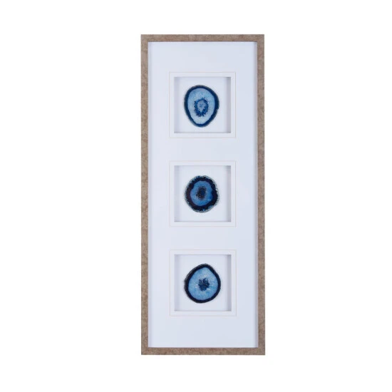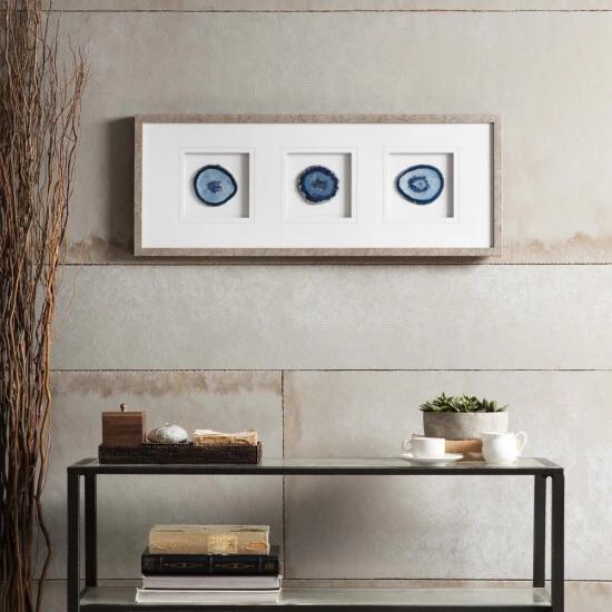 Deck out your walls with this standout piece of art. Blue Agate is a decorative display of a real 4-inch cut of a geode and framed under glass. Each cut is a one of a kind piece and distinct from each other. This will be a beautiful display on its own or it would look great as a set. As this unique piece uses 100-percent real agate stone, color variations may occur from the image due to the natural state of each agate stone. (Artist: Studio 5)