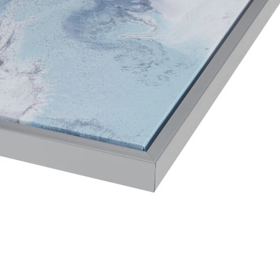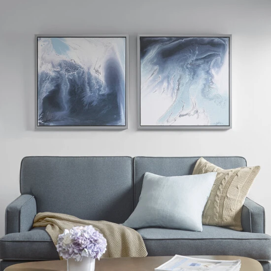 The Madison Park Blue Lagoon 2 Gel Coat Framed Canvas 2 Piece Set by Artist Blakely Bering offers a beautiful and refreshing update to your home decor. Showcasing abstract images in cool shades of blue and white, this canvas wall art set features silver frame detailing that complements and accentuates the contrasting hues and adds a nice luster. A gel coating creates a glossy sheen that protects the colors from fading, while the 3mm MDF backing provides additional structure. Each piece features 2 D-rings on the reverse to easily hang this set together or separately. Comes as a 2 piece set, each piece measuring 25.5×25.5″. Invigorate your home by incorporating this framed canvas two piece set into your living room or bedroom.