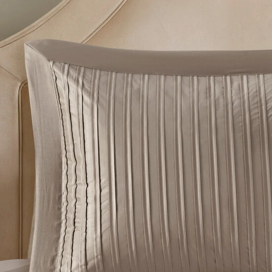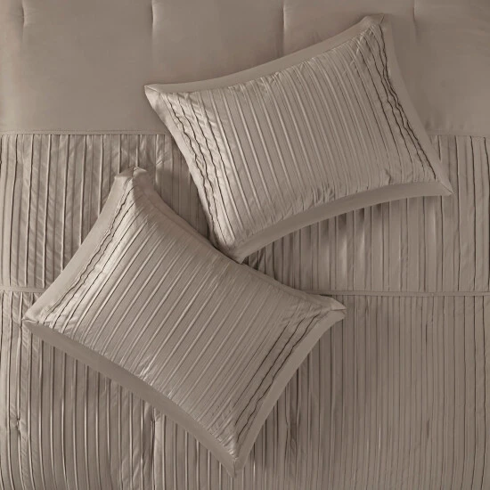 The Madison Park Channing Collection provides a modern look through fabric manipulation. This beautiful taupe polyester charmeuse gives a slight sheen to this bed while the small pleating on the bottom half of the bed and corresponding shams provides great dimension for your room. Three decorative pillows use embroidery and pleating to bring this beautiful collection together. Items in the set may come in a rolled or compressed packaging, which will need to be fluffed up or steam ironed before use to remove wrinkles.