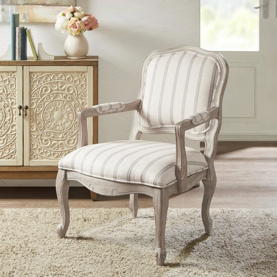 Update your living room decor with the Madison Park Monroe Accent Chair. This accent chair is upholstered in a natural-hued stripe pattern fabric and features pillow-topped arms for a sophisticated look. A reclaimed wood finish complements the upholstery, while the cabriole solid wood legs create an elegant silhouette. Beautifully designed, this accent chair brings a handsome style to your living space. Assembly required.