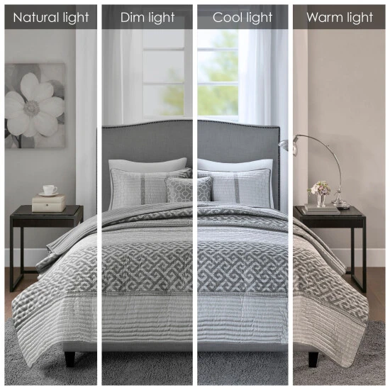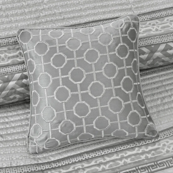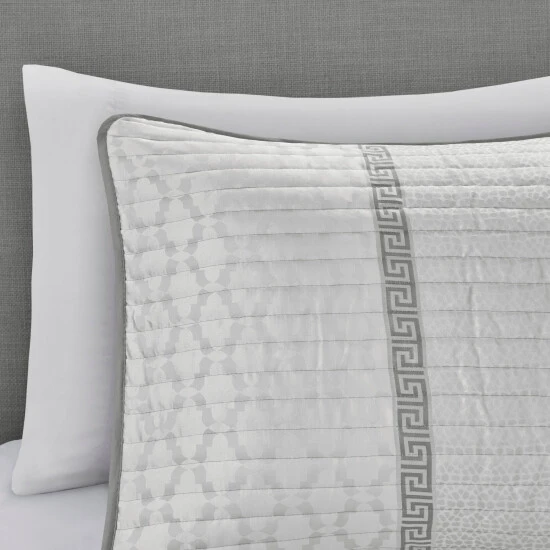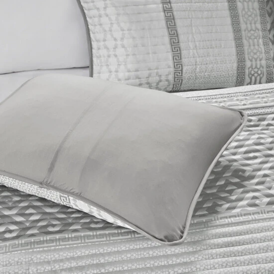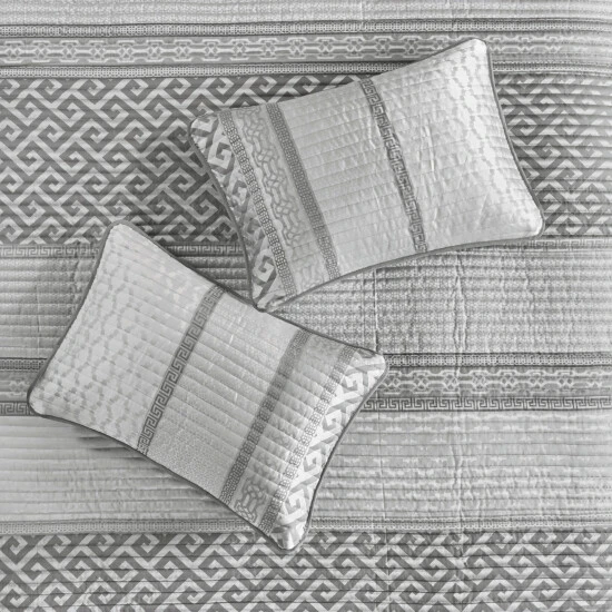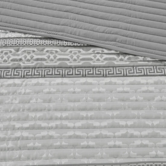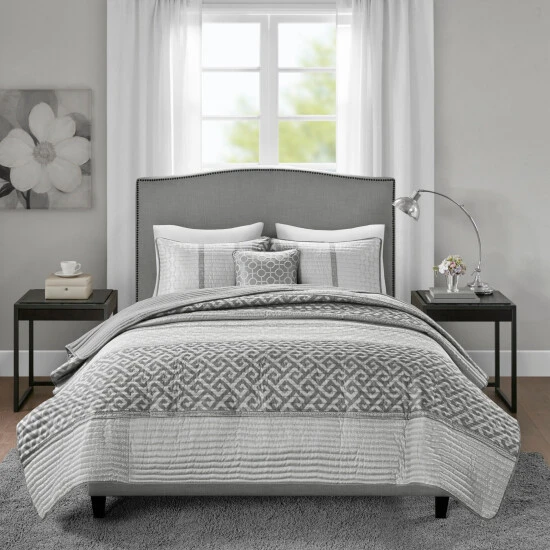 The Madison Park Christian 4 Piece Reversible Jacquard Coverlet Set provides an elegant and luxurious update for your bedroom. This jacquard reversible coverlet features a navy and grey striped design with several geometric prints to create an updated traditional look. The solid reverse complements the top of the bed, while 2 matching shams mirror the design of the coverlet creating a sharp coordinated look. Also included is a square decorative pillow provides the finishing touch to the jacquard quilt cover set. Machine washable for easy care, this reversible coverlet set brings a refined traditional allure to your bedroom that’s perfect for summer or as an added layer in the winter. Items in the set may come in a rolled or compressed packaging, which will need to be fluffed up or steam ironed before use to remove wrinkles.