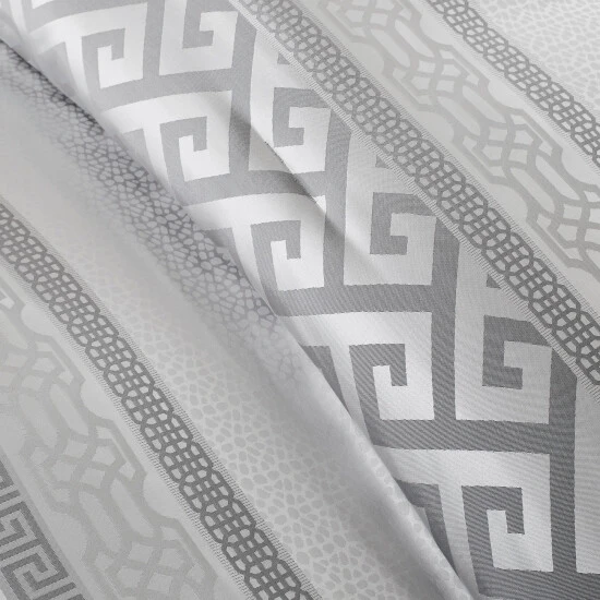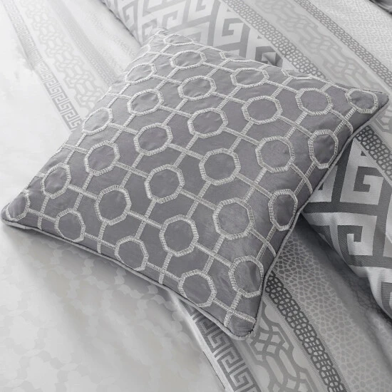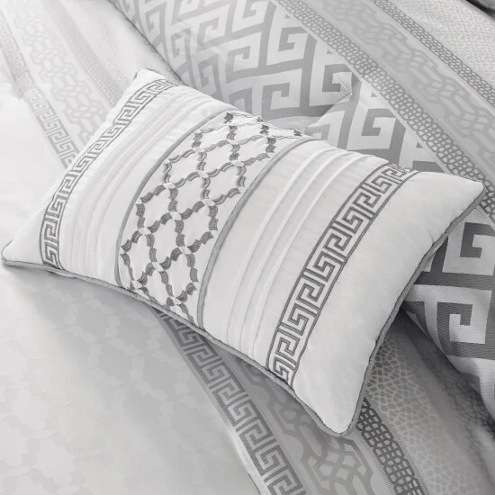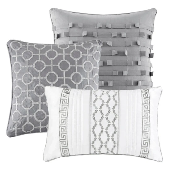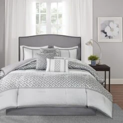 Upgrade your bedding with this upscale seven-piece comforter set from Madison Park. The poly jacquard face features an attractive geometric pattern with variations in each piece. Available in navy or grey on white, this bedding pairs well with nearly any decor style.