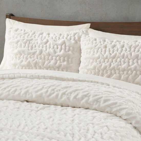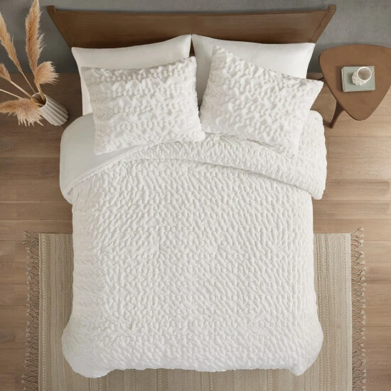 Add glamorous style and comfort to your bedroom with the Madison Park Dakota Ruched Faux Fur Down Alternative Comforter Set. This stylish comforter will liven up your bedroom with its unique texture and beauty. The face features a luxuriously soft faux fur with a stunning ruched design and a solid microfiber reverse. This bedding set includes 1 hypoallergenic polyester filled comforter and 2 shams to complete the look. All pieces are machine washable for easy care. Items in the set may come in a rolled or compressed packaging, which will need to be fluffed up or steam ironed before use to remove wrinkles.