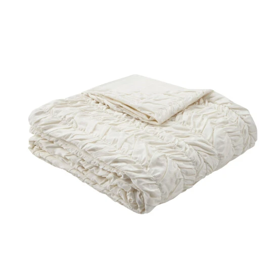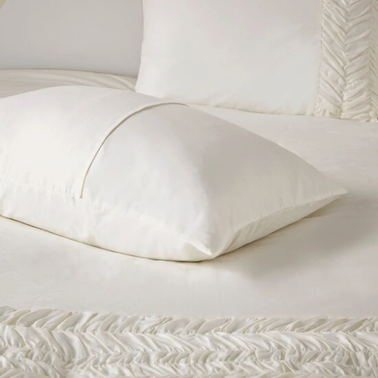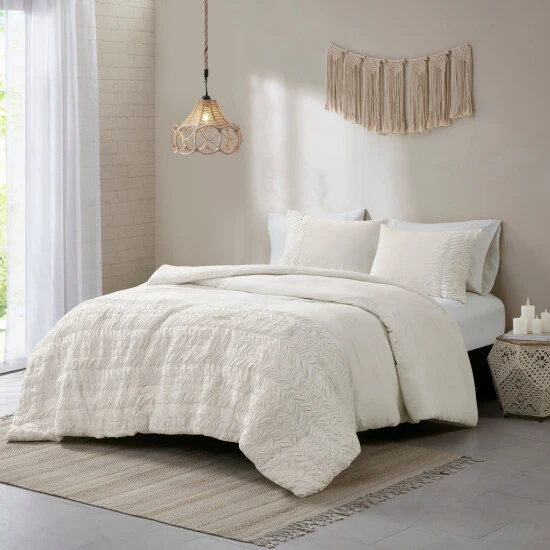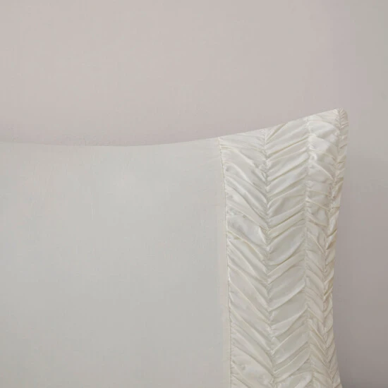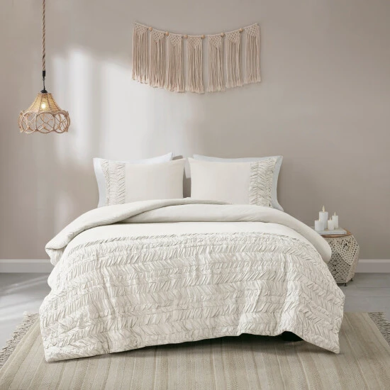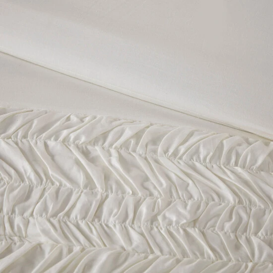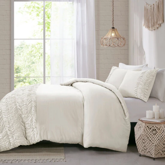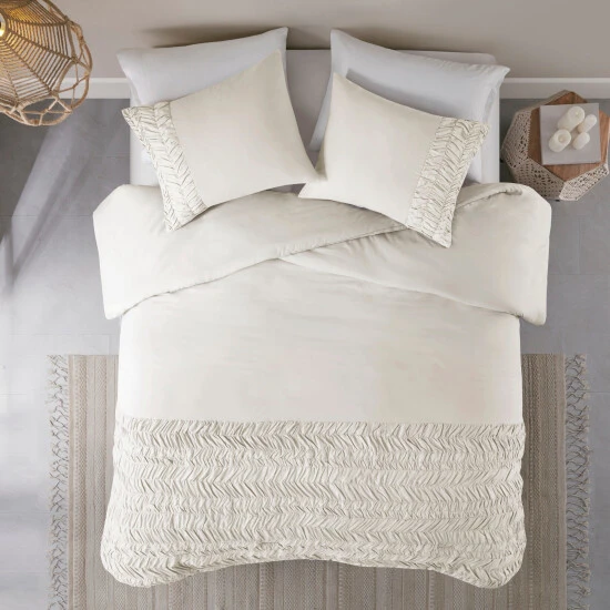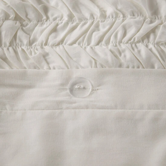 Turn your bedroom into a cozy and clean space with the Madison Park Emma 3 Piece Cotton Duvet Cover Set. This cotton duvet cover features a solid color section with a ruched design at the foot end that adds dimension to the shabby chic look. The 2 matching shams also flaunt a ruched pattern to coordinate with the farmhouse duvet cover. Machine washable for easy care, this cotton duvet cover set brings a comfortable and charming update to your bedroom. A button closure at the foot end secures a padded insert within the duvet cover and inside corner ties prevent it from shifting (insert is NOT included).