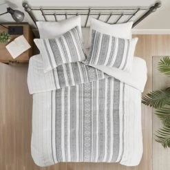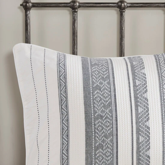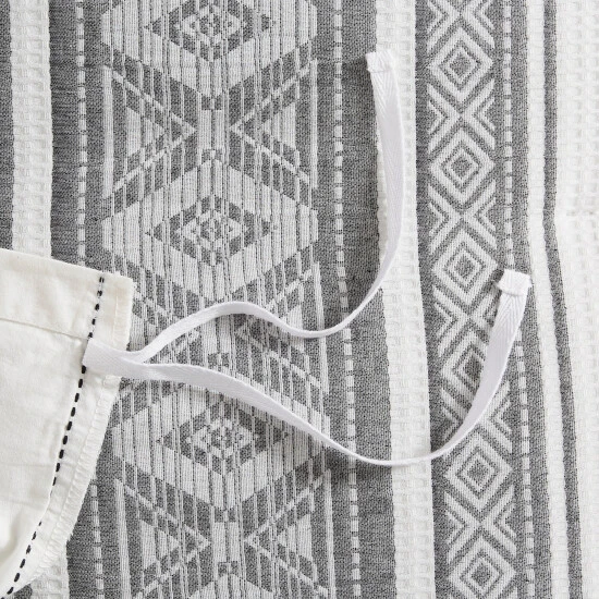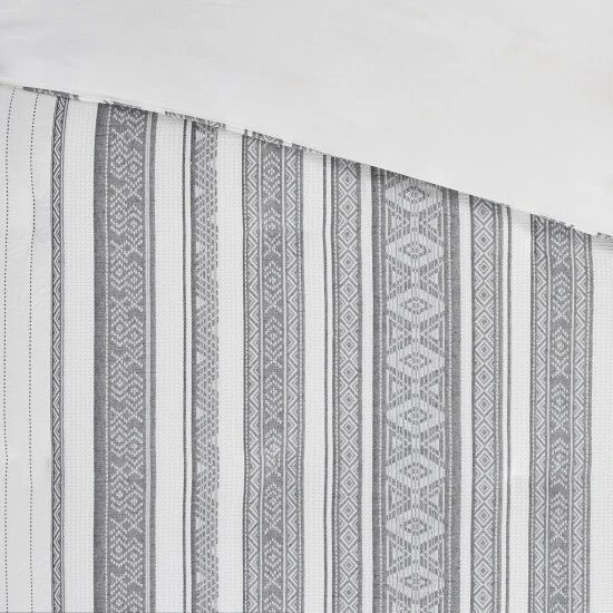 Refresh your bedroom decor with charm of the Madison Park Ezra 3 Piece Cotton Waffle Duvet Cover Set. Flaunting a striped design with geometric details down the center, this cotton waffle jacquard duvet cover creates a chic globally inspired look. The 2 matching shams also showcase a striped pattern to complement the top of the duvet cover, for a perfect pairing. Machine washable for easy care, this cotton duvet cover set has an antimicrobial odor protection treatment that provides built-in freshness protection, inhibits growth of odor causing bacteria, and keeps the fabric newer, longer.