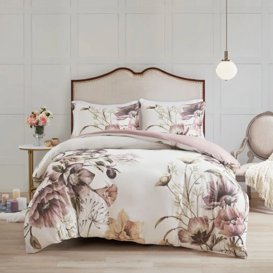 The Madison Park Gisele 3 Piece Cotton Printed Duvet Cover Set offers a beautiful shabby chic update to your bedroom. The cotton duvet cover and shams feature a large floral print, in soft colorful hues, creating a gorgeous look. With its romantic color combination, this shabby chic duvet cover set set brings a soft allure to your bedroom. A button closure helps secure a comforter insert within the duvet cover and four corner ties help prevent it from shifting (insert is NOT included). This bedding set is also OEKO-TEX certified, meaning it does not contain any harmful substances or chemicals to ensure quality comfort and wellness.Β
