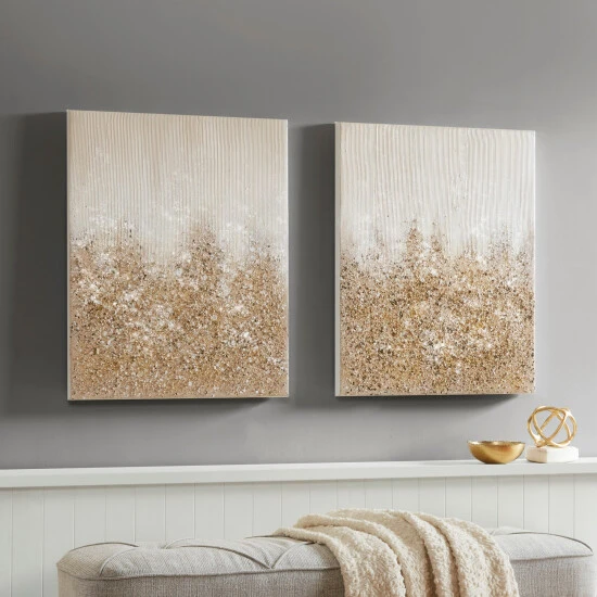 The Glimmer Hand Embellished Canvas 2 Piece Set brings a touch of glam to your home decor. This 2 piece canvas wall art set features a gradient abstract design in metallic hues for a striking modern look. 100-percent hand-brushed with real rock and stone embellishments add texture and dimension, while the metal glitter finish adds a beautiful sheen and luster. Each piece is finished with a cardboard backing for additional structure and 2 D-rings on the reverse making it easy to hang. Give your home a luxurious update by adding the perfect amount of sparkle, with our Glimmer Art Piece Set. Due to hand embellishment of natural rock and stone; colors and glitz may vary slightly from image making each piece unique. Spot clean only; this set includes two pieces with each piece measuring 22×28 inches.