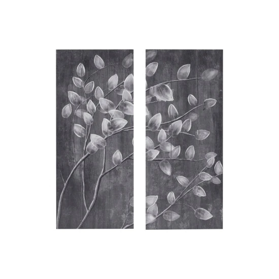 Complete your artistic entryway with this two-piece art set from Madison Park. Constructed from wooden planks and painted with a grey reclaimed finish, this piece fits the vibe of your upscale-rustic farmhouse. A spray of grey branches and leaves spreads across the prints, continuing from one piece to another for a unified effect. Hand-embellished detailing adds a one-of-a-kind artistic look to complete the set. Two D-rings are mounted on the back of each item, so you can hang them quickly and securely.