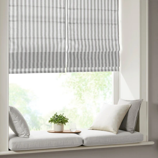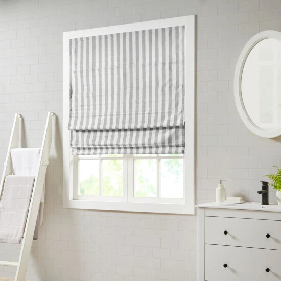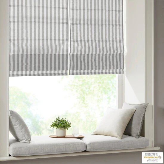 Freshen up your window decor with our Madison Park Hampton Yarn Dyed Striped Light Filtering Cordless Roman Shade. This cordless roman shade features a vertical stripe pattern for a casual and stylish update, while the yarn dyed poly/cotton blend base provide a natural touch for the perfect, modern farmhouse update. A foamback thermal liner is added on the reverse for energy efficiency and enhanced privacy; while the OEKO-TEX certification means there are no harmful substances or chemicals ensuring quality comfort and wellness. The roman shade’s cordless retraction mechanism provides a safe, easy way to open and close throughout the day, while the detachable fabric face allows for easier assembly and cleaning. Please note: The top face fabric is detachable from the hook and loop fastener, but is NOT fully removable. Ready to install right out of the packaging, this roman shade can be hung inside or above the window pane allowing you to find the perfect fit for any space. The shade measures 64-inches long and comes in 4 width options to suit multiple standard window sizes. Each roman shade is sold as a single and comes with hardware and a printed instructional guide; instructional video is also available online. Assembly is required.Β