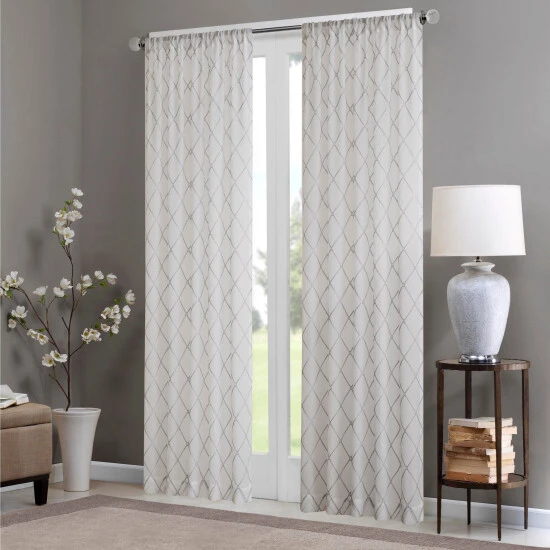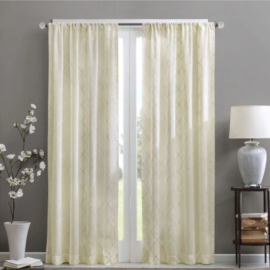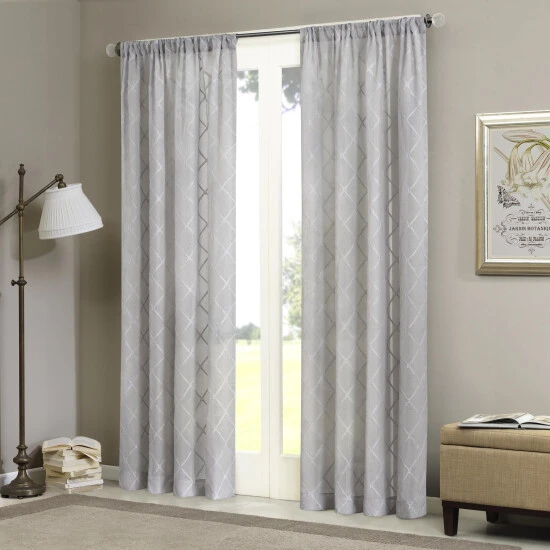 Madison Park?s Iris Diamond Sheer Window Curtain provides an alluring update to your home. An elegant diamond pattern is beautifully embroidered on a soft sheer fabric, adding grace and charm to your decor. The neutral colors and light fabric helps create a delicate look to soften any room. Hang this sheer window curtain using the rod pocket for a simple finish. Fits up to a 1.25″ diameter rod.