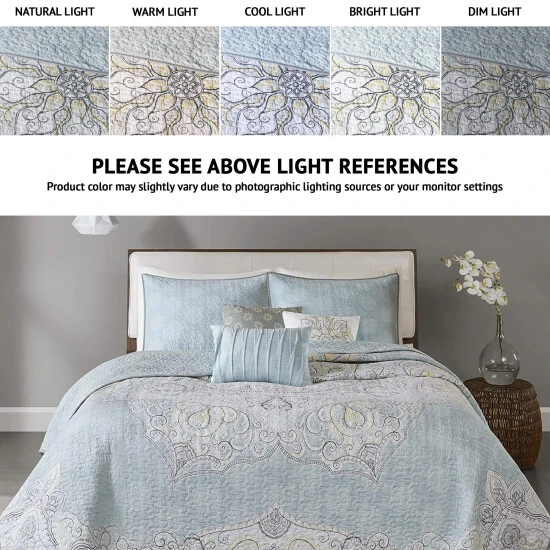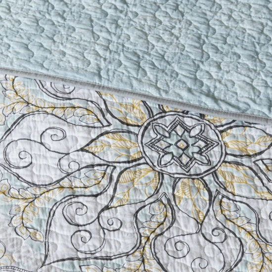 Freshen up your bedroom decor with this lovely coverlet set, including quilt, shams, and decorative pillows. Featuring a medallion design in blues, whites, and greys on one side, and an all-over quilted blue on the other, the reversible coverlet offers versatile looks for your bed. The cotton sateen material lends a smooth, natural softness to your sleeping space.