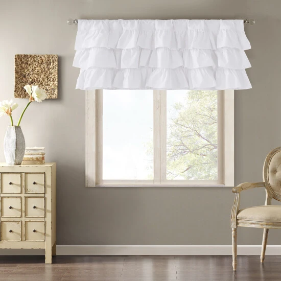 Design a country-chic window treatment with this Madison Park Joycelyn curtain valance. Three rows of ruffles give your room a romantic look, and the 100-percent cotton creates a vintage vibe. The roomy rod pocket slides over your curtain rod in minutes for easy, tool-free hanging.
