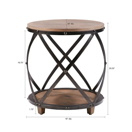 Add to the convenience and style of your space with this unique accent table. The table features a round top and lower shelf, crafted from MDF with ash veneers in a reclaimed grey finish, perfect for holding your must-have items. An open, riveted antiqued bronze finish metal frame gives the table its barrel shape, adding a hint of rustic charm to the design.