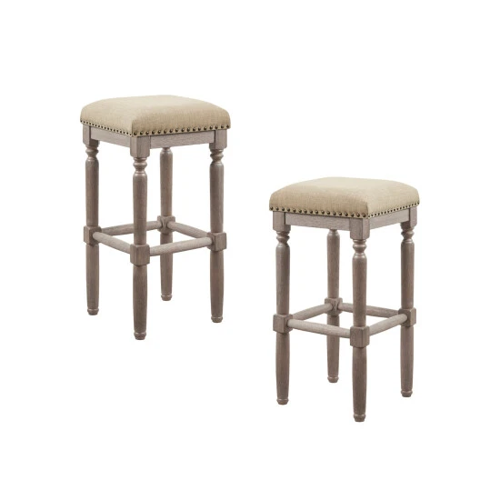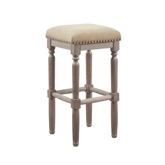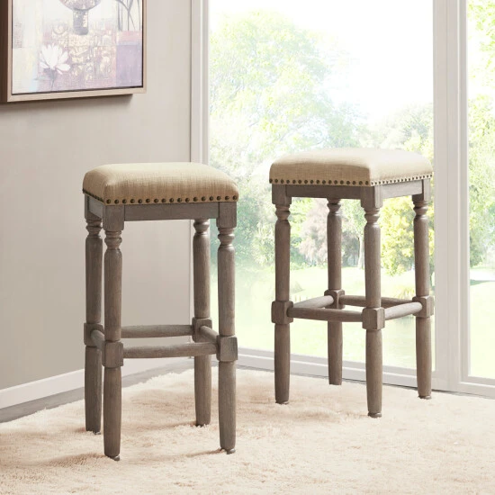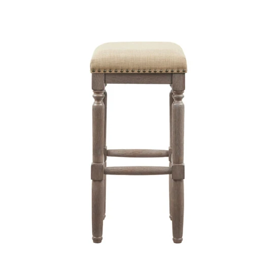 Complete your dining or entertainment space with the Madison Park Kagen Barstool. This set of 2 stools comes in 30-inch seat height. The sturdy frame is constructed from solid wood in a reclaimed wood finish. The seat is upholstered in a smooth grey fabric and embellished with silver nail head accents. Assembly required.