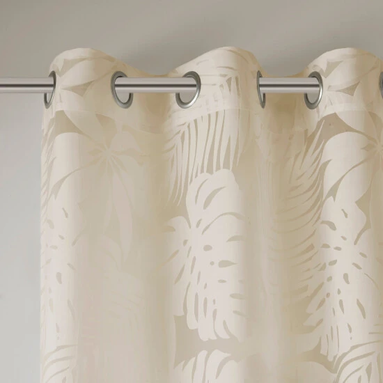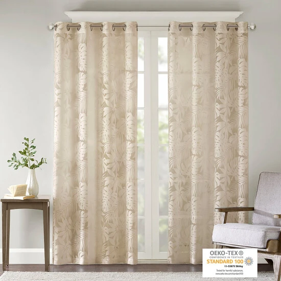 Bring a touch of paradise into your home, with our Madison Park Kauna Palm Leaf Sheer Window Curtain. This panel combines an intricate burnout palm leaf design on a lightweight sheer, creating soft dimension for a relaxed and updated look. This window panel is also OEKO-TEX certified, meaning it does not contain any harmful substances or chemicals, ensuring quality comfort and wellness. The antique silver grommet top finish makes this window curtain easier to hang, open, and close throughout the day. Fits up to a 1.25 inches diameter rod.Β