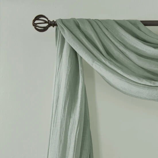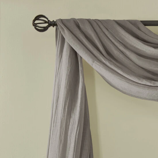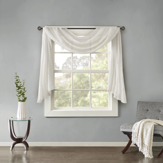 Soften the edges of your window, with our Madison Park Kaylee Solid Crushed Sheer Scarf. This scarf features crushed detailing for beautiful texture, while the lightweight sheer fabric provides easy draping and an airy touch to your decor. Four tabs are also included to make the DIY assembly easy so you can drape the scarf to best fit your window. For a complete look, layer this scarf with coordinating panels or prints in our collection for a more custom appeal.