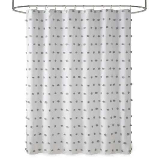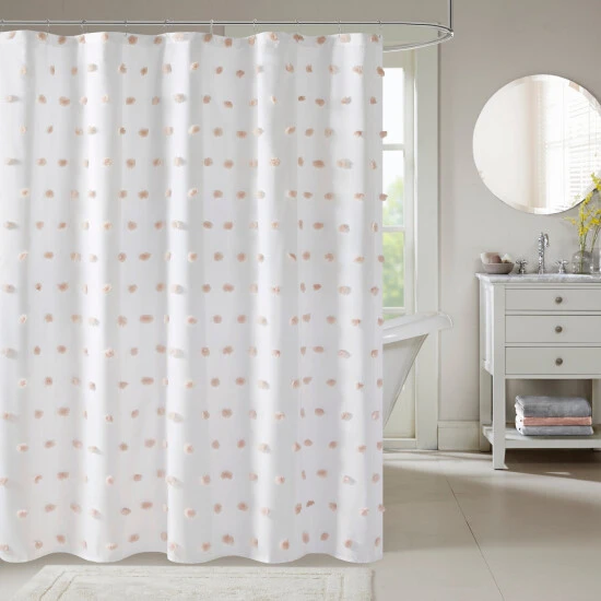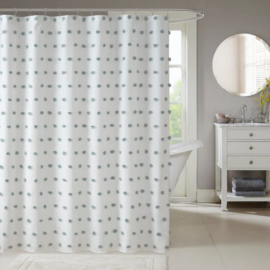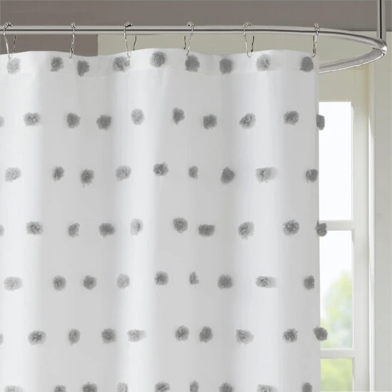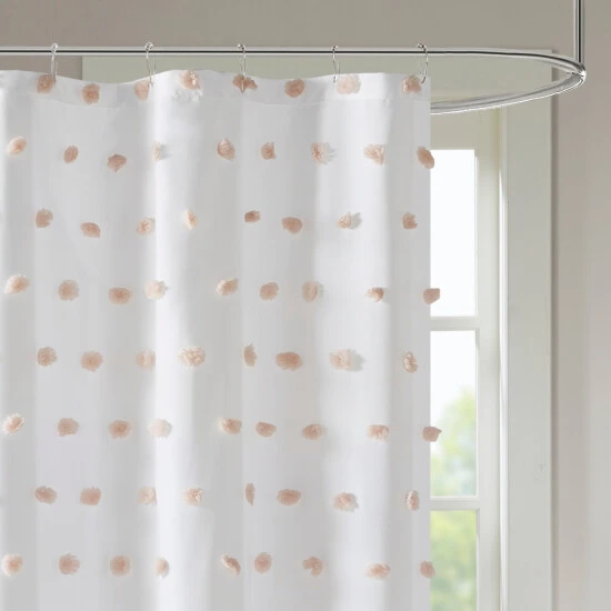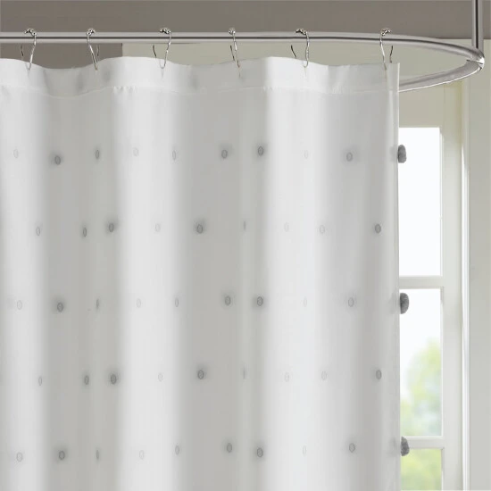 Add a fun update to your space with the Madison Park Lauren shower curtain. The solid white background features rows of soft color fabric pom poms, adding beautiful texture and a stylish update to any bathroom. Machine Washable for easy care; Each shower curtain measure 72×72 inches and is finished with 12 button holes at the top making it easy to hang; hooks, rod, and a water repellant liner are not included and will need to be purchased separately.