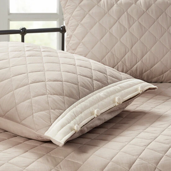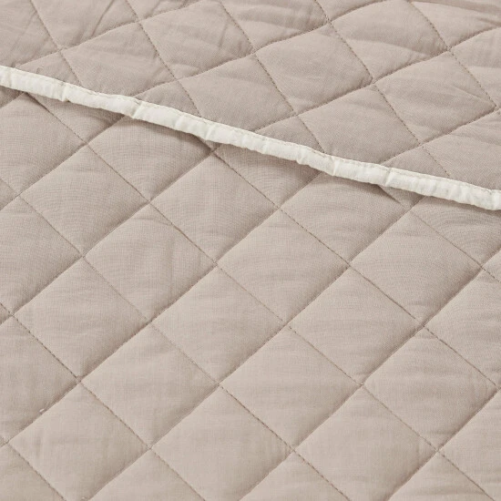 The Madison Park Levine 6 Piece Cotton Daybed Cover Set offers an elegant farmhouse style update for your guest bedroom. This daybed cover features a cotton face khaki fabric with an ivory trim border diamond quilted with hypoallergenic polyester filling, for a soft and sleek country look. Three matching shams pair perfectly with the daybed cover, while an oblong decorative pillow adds a complementary touch. A solid khaki bedskirt with a 15-inch drop is also included to complete this 6 piece daybed set. Machine washable for easy care, this farmhouse cotton daybed cover set brings a refined elegance and soft comfort to your guest bedroom.