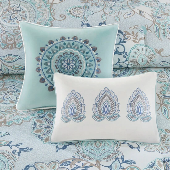 - 1 comforter, 1 bed skirt, 2 shams, 2 euro sham, 2 decorative pillows