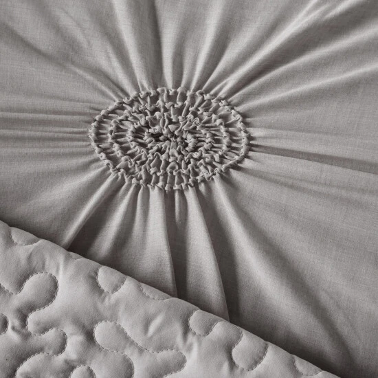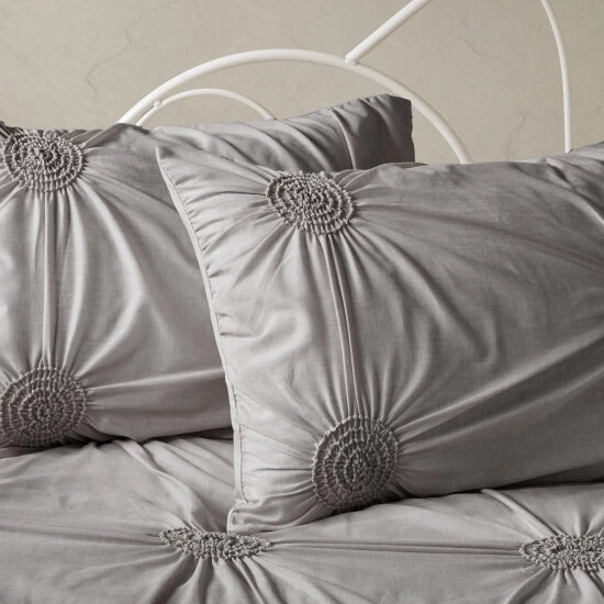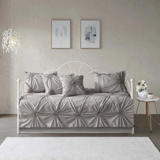 Grace your bedroom with the beauty and comfort of the Madison Park Lorilyn 6-piece Daybed Cover Set. The gorgeous dark grey daybed cover flaunts tufting and ruche detailing in a puckered diamond design, for a charming textural look. Three matching shams mirror the top of the daybed coordinating beautifully with the rest of the ensemble. An embroidered decorative pillow adds a stunning accent, while a solid bed skirt provides a clean finish to complete the bedding set. Displaying a yarn dye look, this tufted daybed cover set brings grace and elegance to your guest bedroom decor.