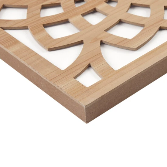- Laser cut floral medallion design in distressed natural wood color