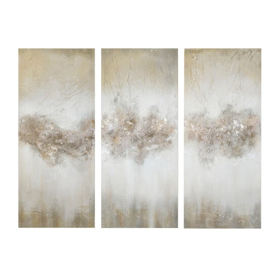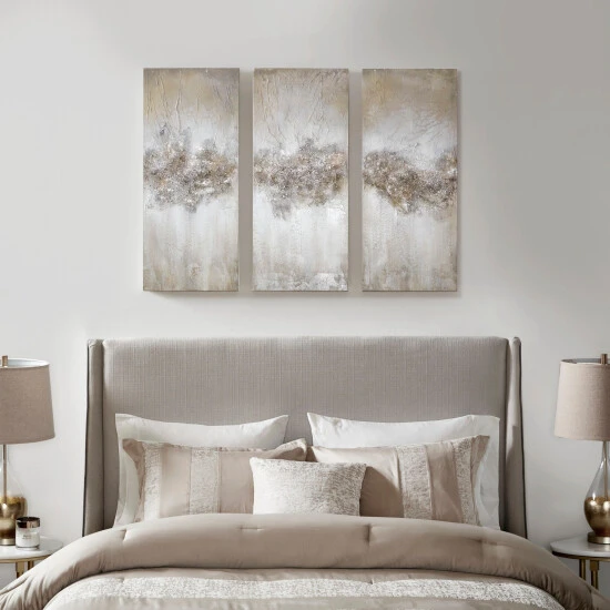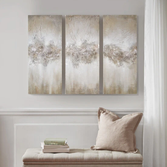 Accent your space with the contemporary allure of our Madison Park Luminous Hand Painted Canvas 3 Piece Set. 100-percent hand-painted, this canvas wall art set showcases rich natural and taupe ascending shades to create a warm contrasting abstract look. Natural rock and stone embellishment on each canvas create beautiful texture and dimension, while a glitter finish adds a rich sheen and luster. Each piece also features 2 D-rings on reverse making it easy to hang, while an MDF backing provides additional support and structure. Hang this three piece hand-painted canvas set in your living room, dining room, or entry way to bring a chic modern sparkle to any space.