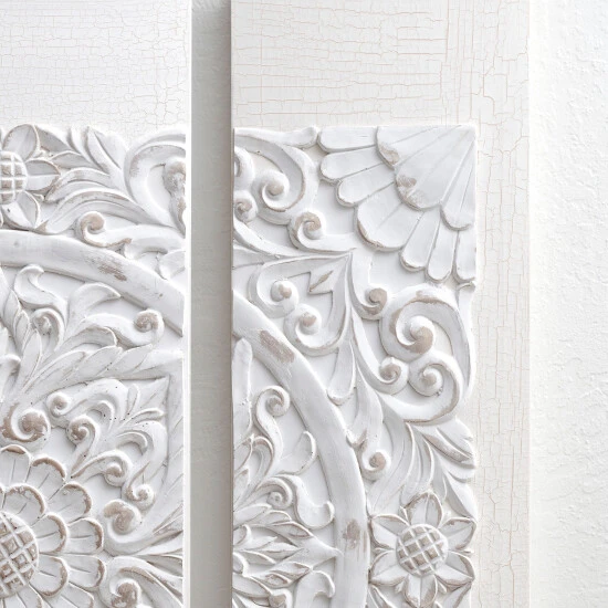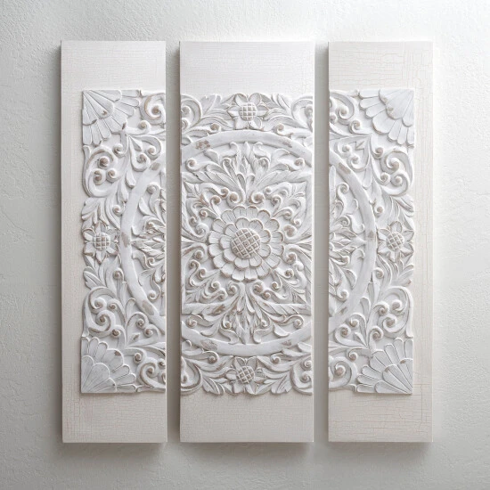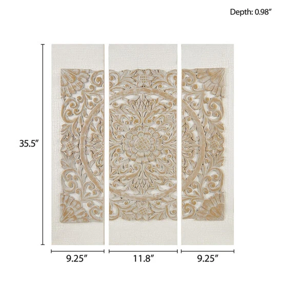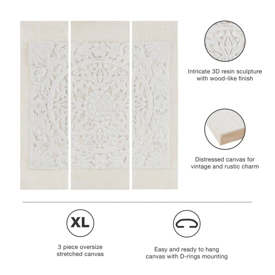Hang our Madison Park Mandala 3D Embellished Canvas on your wall to create a unique focal point in your space. An intricate carving design with the look and feel of wood is made from durable resin, then attached to the embellished canvas and set among each piece of this 3PC wall decor. The embellished canvas is featured in a colorful washed tone on a purposefully distressed, adding a rustic charm to the look. Globally inspired, this alternative wall decor adds a stunning texture and unique Boho touch to any room in your home.