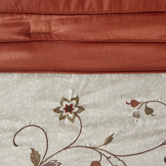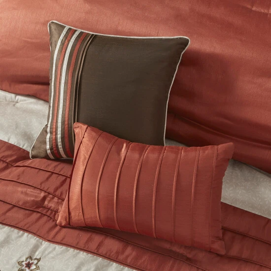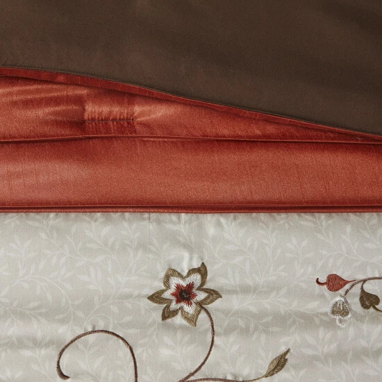 Make your guest room look more accommodating with this Madison Park Mandara seven-piece comforter set. Featuring floral patterns in spice red for charming appeal, this comforter set is crafted from polyester for durability and comfort and is machine-washable for convenient laundering.