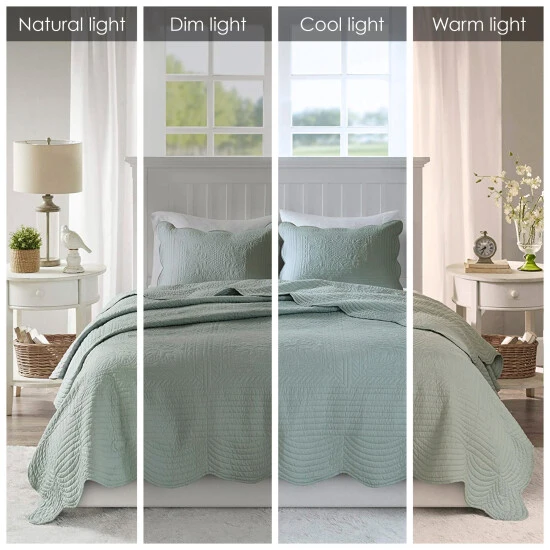 - Cottage/country style quilted reversible coverlet set in scallop edge