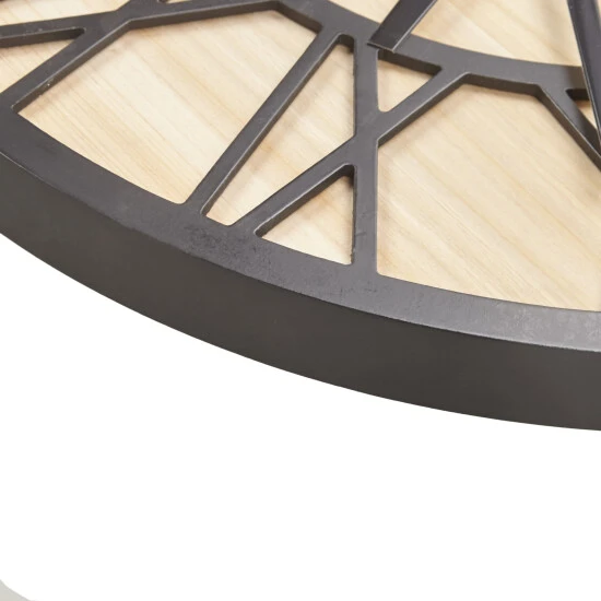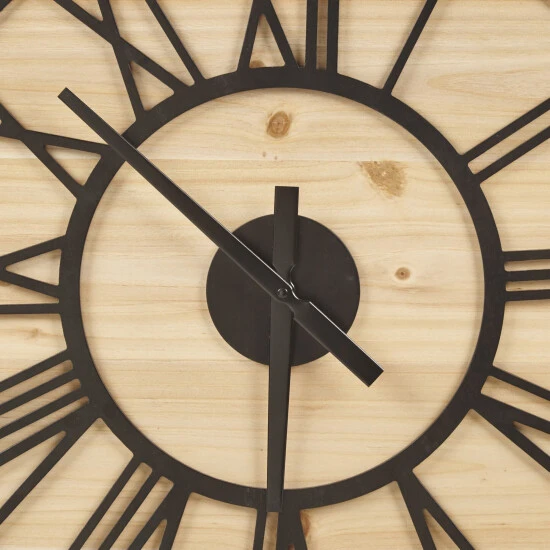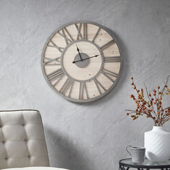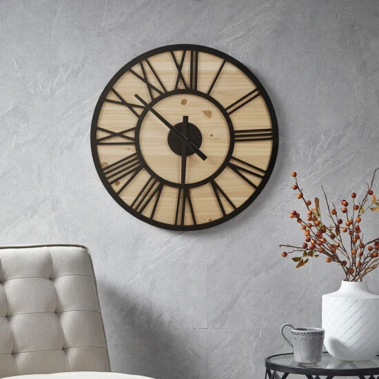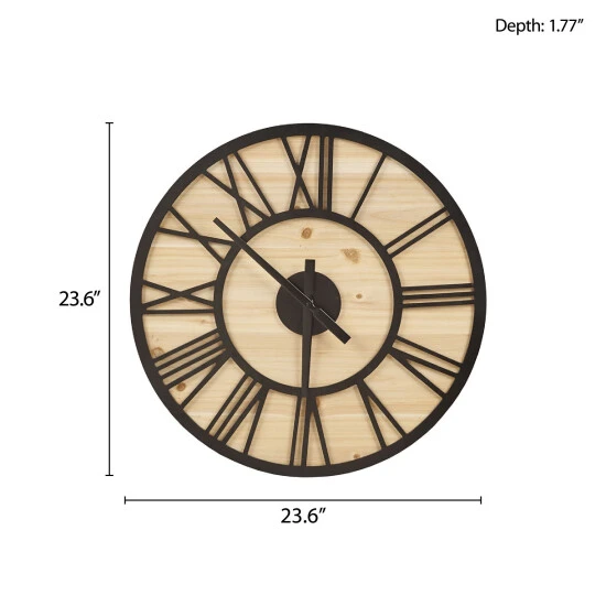 The Madison Park Mason Wall Clock offers a contemporary rustic charm to your home decor. This round clock features a metal frame with Roman numerals on a wood grain MDF, creating charming farmhouse look. A hanger hook on the reverse makes the clock easy to hang in any room. Measuring 23.6″, this large wall clock has quartz movement and brings a modern update to your decor. 1 AA battery (sold separately) is needed. Due to nature of real fir wood surface, product face will vary with some discoloration and wood knots (dot-like markings) unique to each piece.
