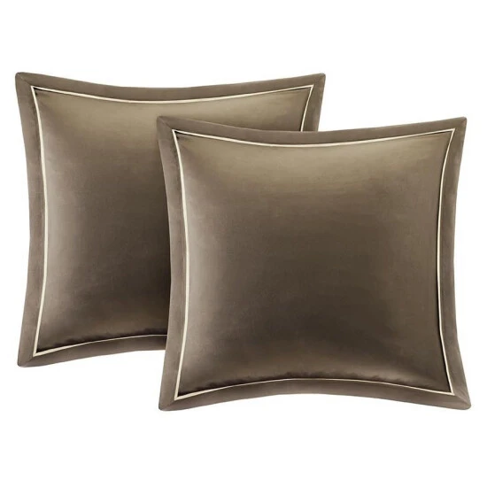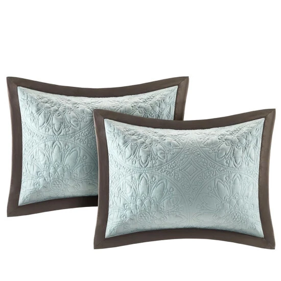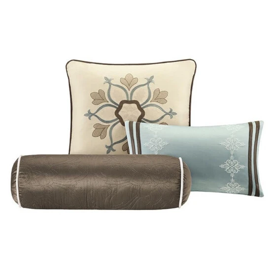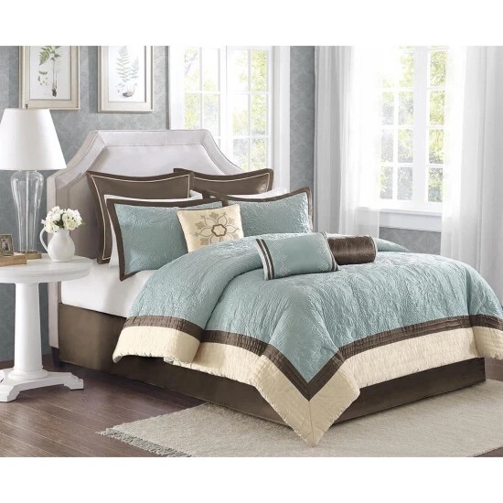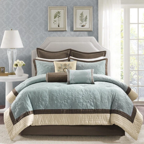 Revamp your sleeping area in one easy step with this nine-piece comforter set from Madison Park. The cream-hued colorway imbues your space with a calm, soothing ambiance for restful sleep. Quilted floral medallions accented by bands of contrasting and complementary fabric add visual appeal to this easy-to-maintain bedding.