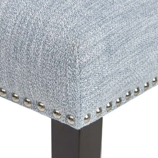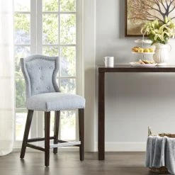 Enjoy a meal in timeless, elegant style with this counter stool, which is upholstered in cheerful, striking light blue fabric with a gorgeous silver nailhead trim. A high back and foam seat help you to stay comfortable, and the durable wooden frame has an easy-to-match natural finish and a strong, sturdy feel.