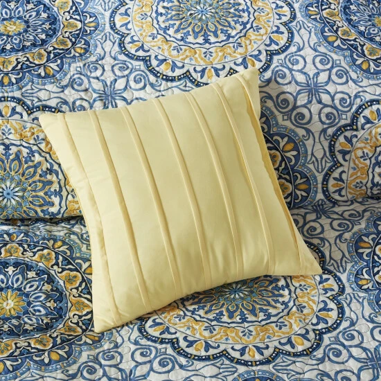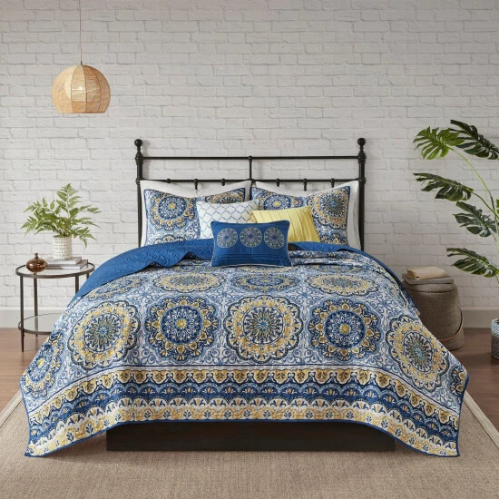 Create a private oasis in your bedroom with this Moraga blue coverlet set by Madison Park. Designed with a bold blue and yellow floral print, this bedding set offers a unique look that blends well with traditional, contemporary, or modern decor. This set comes with matching shams and three decorative pillows for a complete look.
