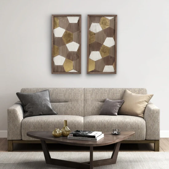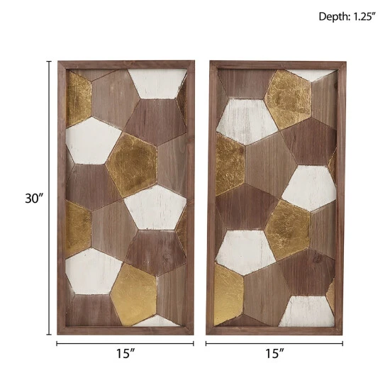 Our Madison Park Motley Geo Wood Carved Wall Panel 2 Piece Set adds a refined mid-century touch to your home decor. This AWD wall art features a geometric pattern hand-painted in gold foil, rustic white, and brown tones, for a rich contrast and modern update. A dark wood natural MDF frame outlines each carved wood wall decor complementing the intricate design and stylish color palette, while 2 D-rings on the reverse of each piece makes this set easy to hang together or separately fitting and updating any space.Β