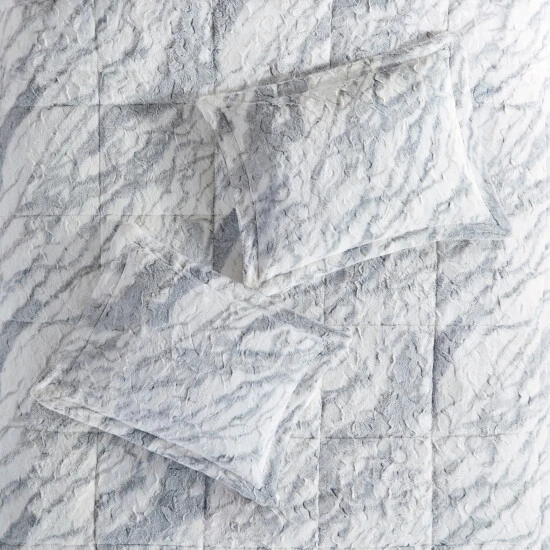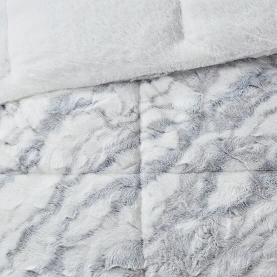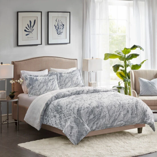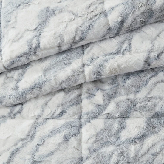 Feel the warmth and comfort when you slide into bed with the Madison Park Naomi Long Faux Fur Comforter Set. This long faux fur comforter and shams feature a grey and blue marble pattern on a white base, for a chic modern look. A solid faux mink on the reverse creates an incredibly soft feel, while giving another look to choose from. Hypoallergenic polyester filling in end-to-end box sewn quilting provides exceptional warmth and comfort. Machine washable for easy care, this luxurious faux fur comforter set gives brings a a stunning touch of glam to your bedroom decor. This comforter set is also OEKO-TEX certified, meaning it does not contain any harmful substances or chemicals to ensure quality comfort and wellness.