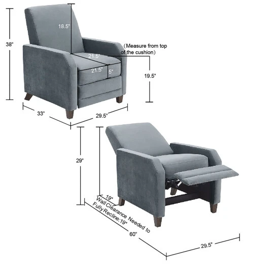 - 1 Recliner:29.5 inches wide x 33 inches deep x 38 inches highΒ