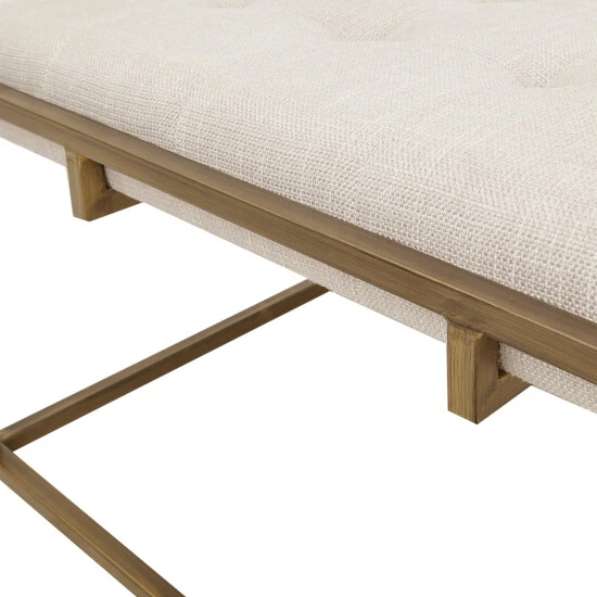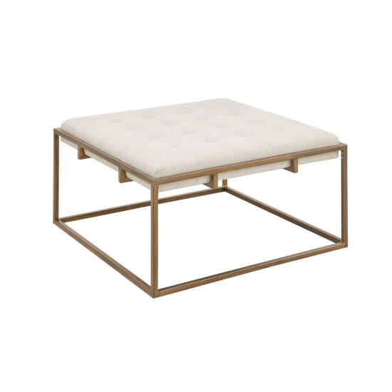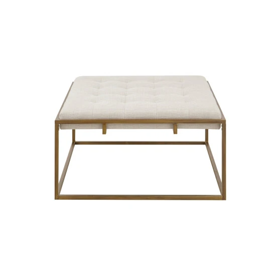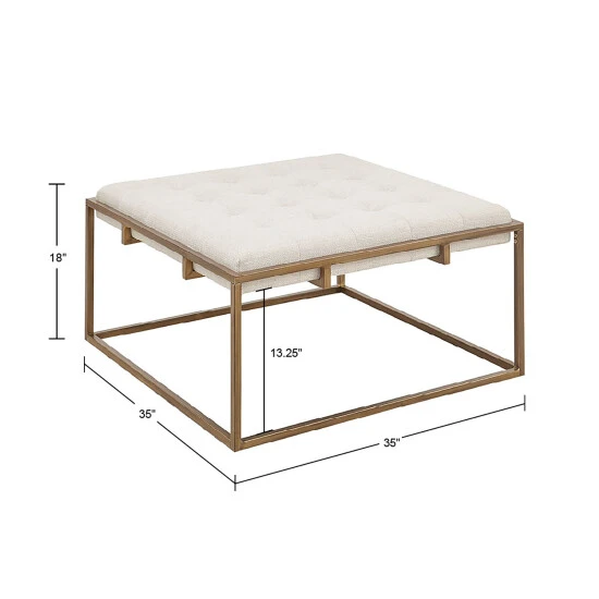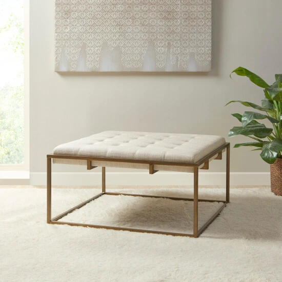Elevate your living room dΓ©cor with the elegance of the Madison Park Orrell Ottoman/Coffee Table . This square ottoman/Coffee Table Β is upholstered in a rich ivory fabric and features a tufted top that adds a sophisticated touch to the modern look. An antique bronze finish on the metal frame beautifully contrasts the upholstery, completing the contemporary design. Simple, yet elegant, this upholstered ottoman/Coffee Table serves as the perfect focal point to your living space. Some assembly required.