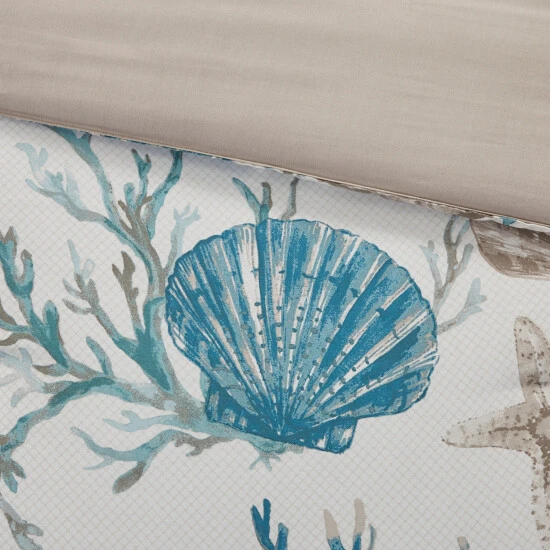 For a vibrant coastal update to your bedroom, the Madison Park Pacific Grove 7 Piece Cotton Sateen Comforter Set is perfect for you! This coastal comforter features all-over printed shells, starfish, and coral in vivid colors to brighten your space. The soft cotton/polyester reverse is a solid color that complements the coastal design. The 2 matching shams beautifully coordinate with the cotton comforter, completing the coastal look. Also included are 3 decorative pillows with coastal embroidery details that add dimension to the top of the bed, while a solid bed skirt adds the finishing touch. Hypoallergenic polyester filling in the comforter and decorative pillows are treated to be dustproof and contain no allergens. This cotton comforter set is OEKO-TEX certified, meaning it does not contain any harmful substances or chemicals to ensure quality comfort and wellness. Machine washable for easy care, this casual bedding set may come in rolled or compressed packing and will need to be fluffed up. Use a steam iron to help remove wrinkles easier.