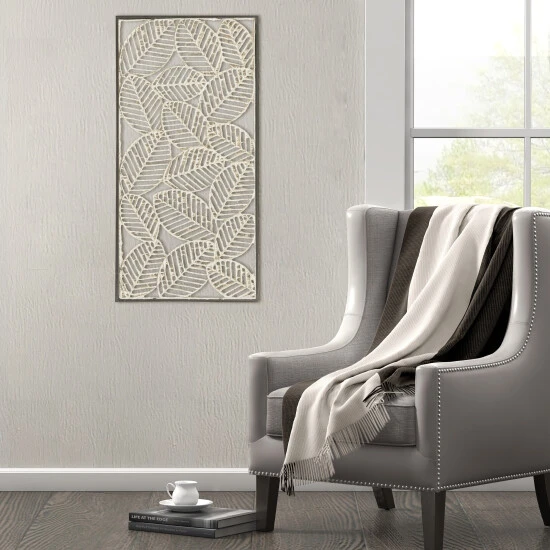 Fill an opening on your gallery wall with the unique texture and design of this Madison Park paper cloaked leaves wall decor. The cutout look and textured white paper finish make the leaves stand out with intricate detail that draws the eye, and the metal framework creates a stable support system for the design and adds contrast around the edge of this wall decor. This piece features hooks integrated into the metal frame for easy, sturdy hanging either vertically or horizontally to fit your contemporary space easily.