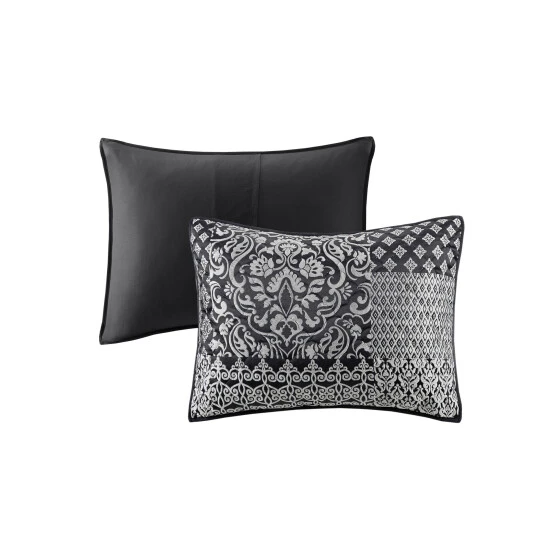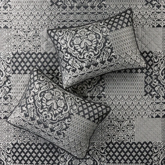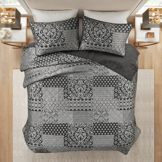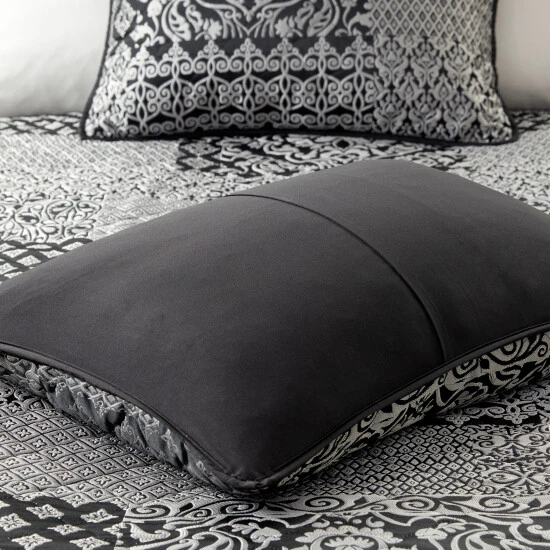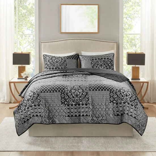 Elevate your bedroom with the bold elegance of the Madison Park Paxton 3 Piece Jacquard Reversible Coverlet Set. This polyester jacquard coverlet flaunts a medallion design on the top with a soft black microfiber reverse, for a luxurious transitional look. The 2 matching shams pair handsomely with the coverlet to complement the sophisticated design. Machine washable for easy care, this jacquard comforter has an antimicrobial treatment to provide built-in freshness protection, inhibit growth of odor causing bacteria, and keep the fabric newer, longer.