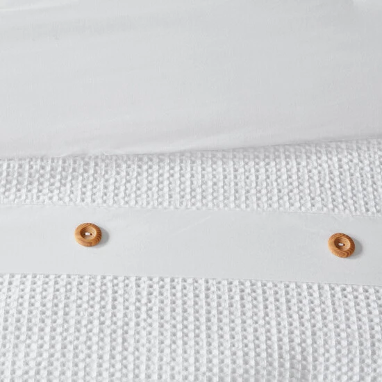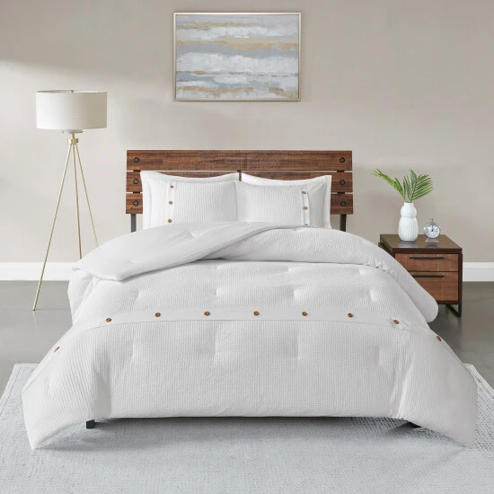 Give your bedroom a simple and clean look with the Madison Park Rianon 3 Piece Cotton Waffle Weave Comforter Set. The 100-percent cotton comforter and shams feature a waffle weave that creates a soft textured look and feel. Decorative wood button details add a charming and functional accent. With a fresh contemporary style, this comforter set pairs perfectly with any bedroom decor. This bedding set is also OEKO-TEX certified, meaning it does not contain any harmful substances or chemicals to ensure quality comfort and wellness.