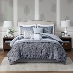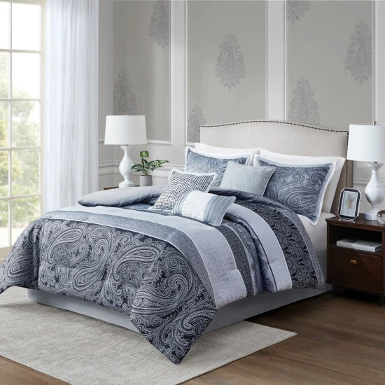 Create a sophisticated allure in your bedroom with Madison Park’s Richard 7 Piece Jacquard Comforter Set. This traditional jacquard comforter features gray paisley designs artfully arranged in a striped motif, for a striking luxurious look. The solid gray microfiber reverse provides additional comfort for a soft feel, while the two matching shams help elevate the glamorous design. Three decorative pillows with embroidered details and a solid gray bed skirt add the finishing touches to complete this luxurious bedding set. Machine washable for easy care, this jacquard comforter set brings lavish comfort and elegant style to transform your bedroom decor.