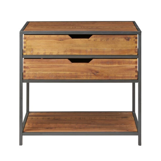 The natural beauty of the honey tone solid acacia is combined with clean lines of the gun metal finished metal to create beautiful storage that compliments every setting. Two drawers and a lower shelf make an attractive accent storage chest.