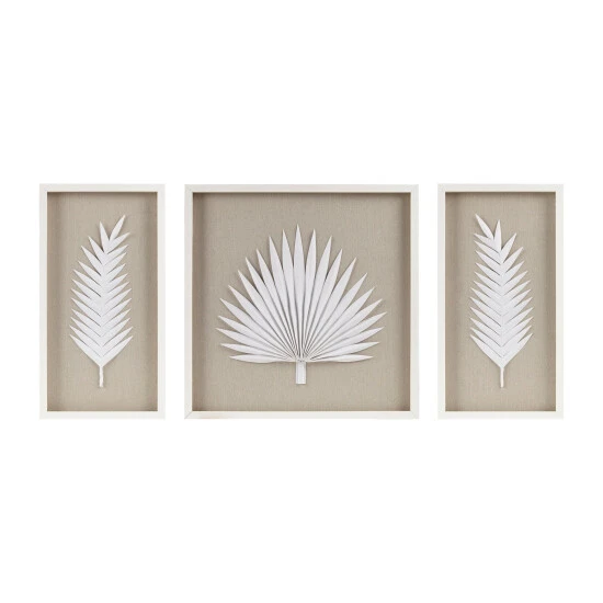 Refresh your space with the coastal elegance of the Madison Park Sabal Palm Rice Paper Framed Shadow Box 3 Piece Set. Each shadow box features a handmade, rice paper palm on a soft linen ground for a naturally modern and unique botanical design. Placed under glass and finished with a white frame for an elevated, gallery look and feel. 2 D-rings on the reverse of each piece makes this 3 Piece set easy to hang in any living room, entryway, or bedroom; Hang this set together for a large focus wall decor or hang pieces separately to fit any space and tie a room together. Spot clean only.Β